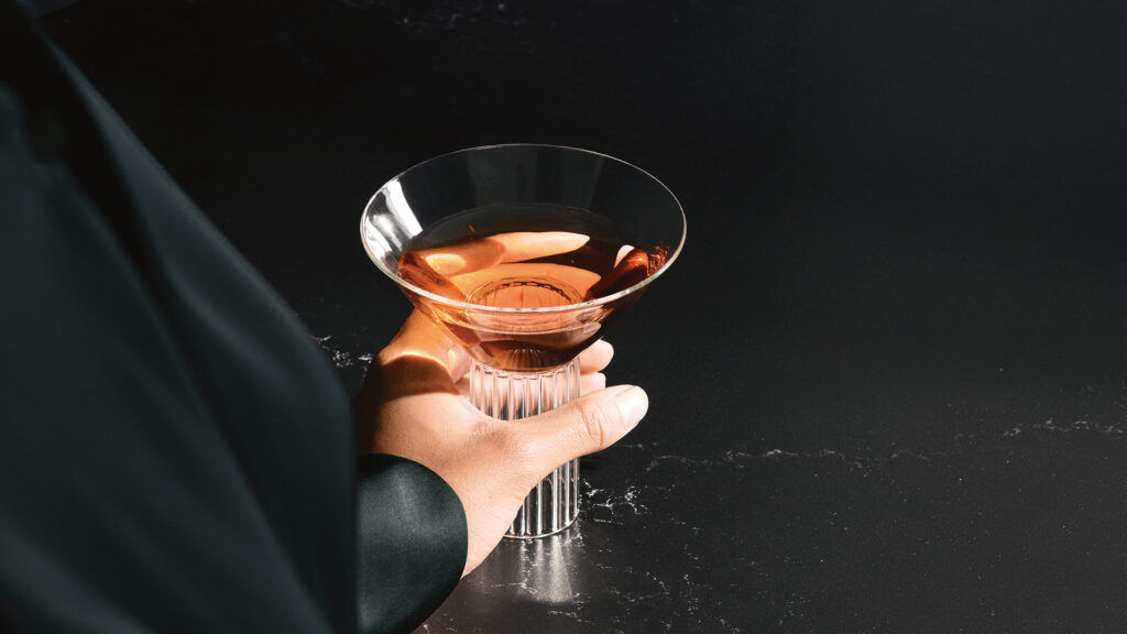 A deep, dark stone, mysterious and opulent, with touches of fine white veining that flow organically across it, contrasting and blending together into a one-of-a-kind surface.
