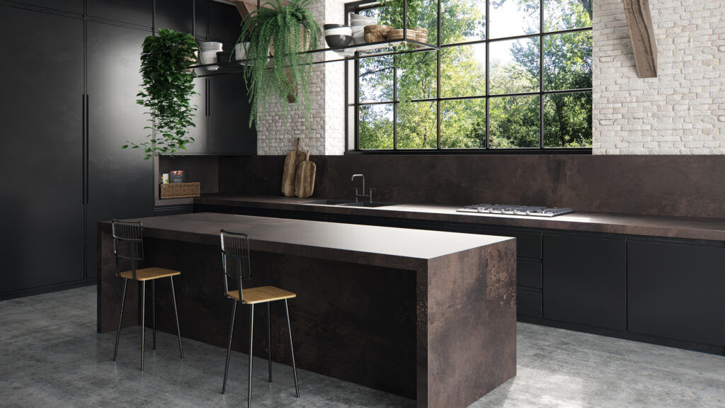 Russet browns and tarnished reds swirl together to form a raw effect, fired and seemingly scorching hot, yet embedded with an authentic aged texture that adds tactility, in Honed finish.